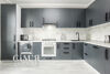 Современная встроенная кухонная мебель, большой обеденный стол, стулья.