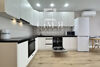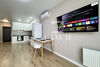 Большая и просторная кухня-студия, которая разделена на кухонную зону и зону для отдыха с диваном и телевизором.